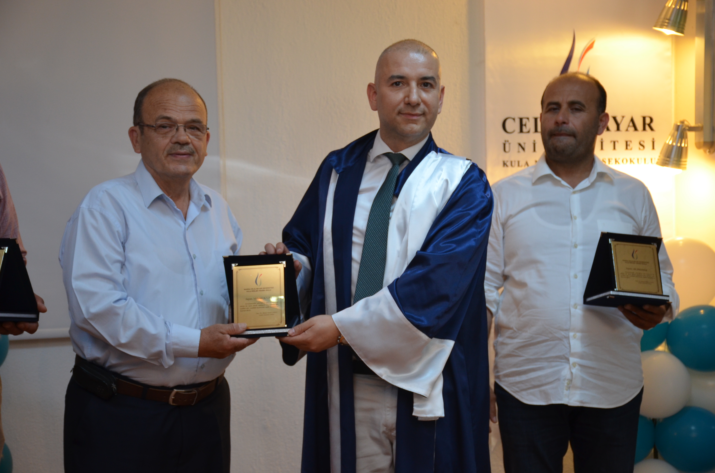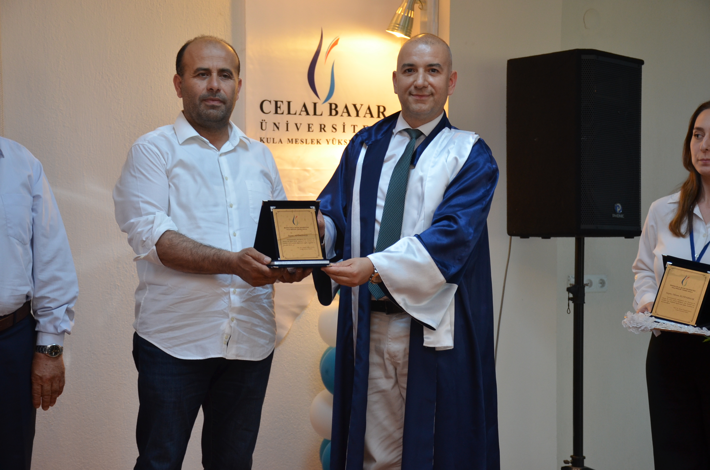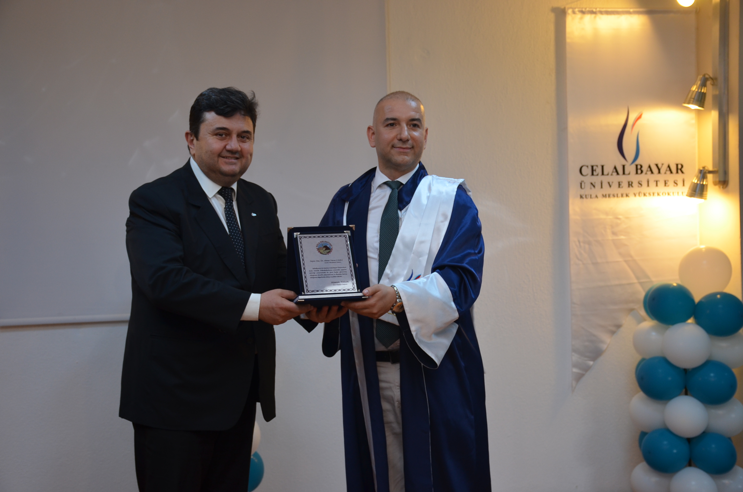 Kula Belediyesi ile Manisa Celal Bayar Üniversitesi Kula Meslek Yüksekokulu arasında yapılan işbirliği çerçevesinde bu güne kadar göstermiş olduğu özverili çalışmaları ve Kula’ya katmış oldukları değerlerden dolayı teşekkür eden Kula Belediyesi Başkan Vekili Nejat Gülmez, Meslek Yüksekokulu Müdürü Doç. Dr. Ahmet Yavuz ÇAMLI ve Meslek Yüksekokulu sekreter vekili Hasan Ali ŞAHİN’e teşekkür plaketleri verdi. Daha sonra tüm öğrencilere başarı belgeleri verilirken, okul birincisi Berna ARIK’ın mezuniyet andını okumasının ardından kep atımı ile tören sonlandı.