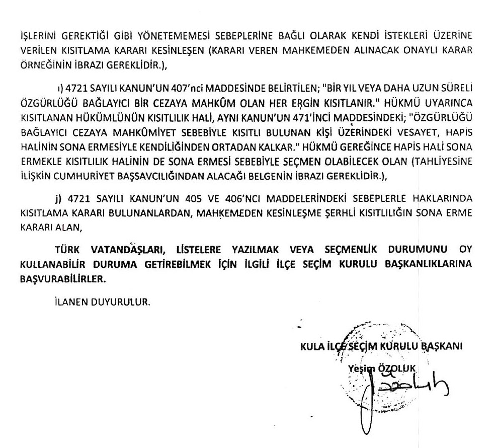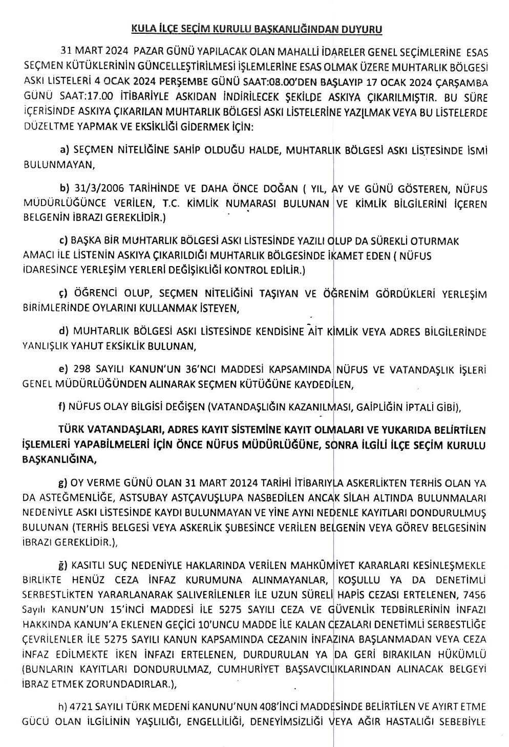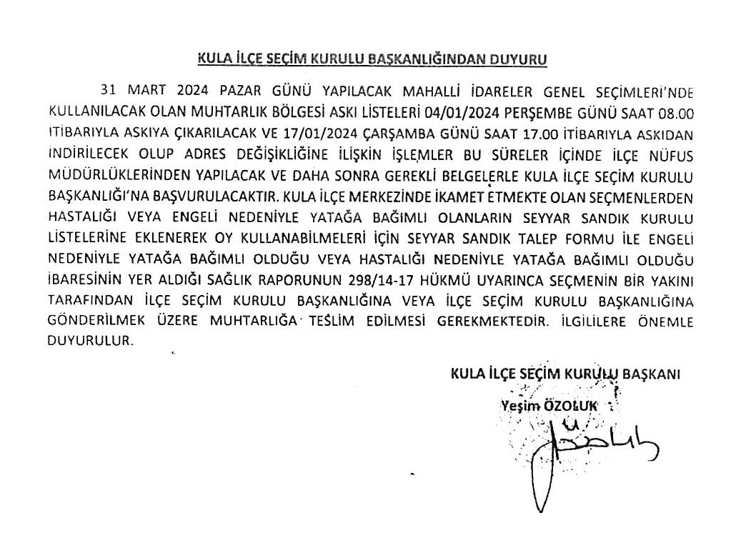 31 Mart 2024 Pazar günü yapılacak olan mahalli idareler genel seçimleri için seçmen kütükleri askıya çıktığını duyuran Kula İlçe Seçim Kurulu duyuru yayınladı. Buna göre seçmen kütükleri 04 Ocak 2024 Perşembe gününden, 17 Ocak Çarşamba gününe kadar muhtarlık binalarında askıya alındı.