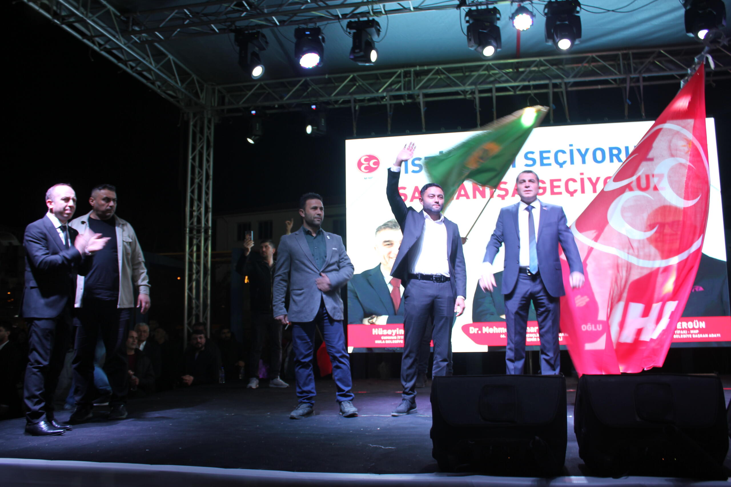 Cumhur İttifakı Kula Belediye Başkan Adayı Hüseyin Tosun’un proje tanıtımı ve Cumhur İttifakı Belediye Meclis üyesi adaylarının tanıtımı içim miting düzenlendi. Mitinge 66. Hükümet Gençlik ve Spor Bakanı Ak Parti İzmir Milletvekili Dr. Mehmet Kasapoğlu’nun katılımıyla coşkunun tavan yaptığı alanda sürpriz bir gelişme yaşandı. Yakın zamanda partisinden istifa eden önceki İyi Parti Kula İlçe Başkanı Mehmet Yurt ve Memleket Partisi Kula İlçe Başkanı Nazır Yaşar, kalabalık bir heyetle mitinge katılarak Başkan Adayı Hüseyin Tosun’a desteklerini açıkladılar. Başkan Adayı Hüseyin Tosun’da bu jeste karşılık vererek Kula’da siyasi arenanın genç, çalışkan ve dinamik yüzleri olan Başkanlar Mehmet Yurt ve Nazır Yaşar’ı sahneye davet ederek Ak Parti İlçe Başkanı Eyüp Yavuz Aşkın, MHP İlçe Başkanı Nazım Baytok ile birlikte el ele verdiği birlik ve beraberlik görüntüsü alandaki kalabalık tarafından uzun süre alkışlandı.