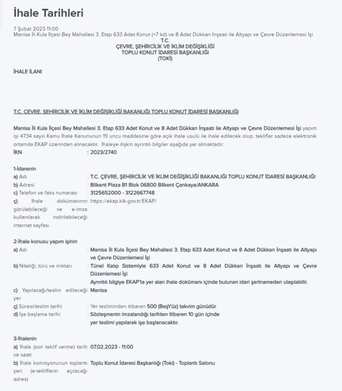 Çevre, Şehircilik İklim Değişikliği Bakanlığı Toplu Konut İdaresi Başkanlığı (TOKİ) tarafından 3. Etap Kula Toplu Konut projesi için ihale tarihi ve konut sayısı duyuruldu.