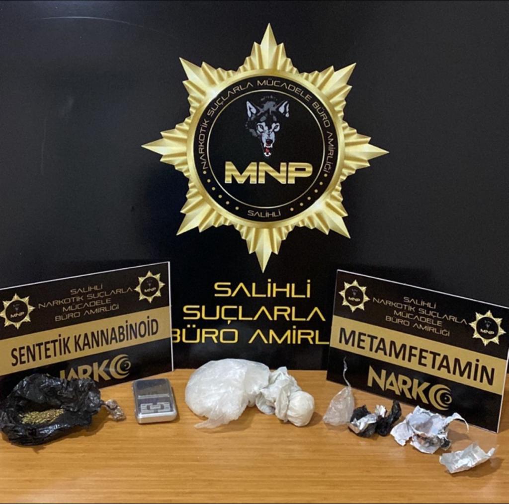 Manisa İl Emniyet Müdürlüğü Narkotik Suçlarla Mücadele Şube Müdürlüğü Salihli Büro Amirliği görevlilerince uyuşturucu veya uyarıcı madde ticareti yapan, nakleden ve kullanan şahıslara yönelik yapılan çalışmalar kapsamında Salihli ilçesinde iki ikamette yapılan aramada;▪20,95 gram Metamfetamin maddesi,▪3,36 gram Esrar maddesi,▪1 adet Hassas Terazi ele geçirilmiştir.Konuyla ilgili C. T. (34) ve K. B. (37) isimli 2 şüpheli şahıs uyuşturucu veya uyarıcı madde imal ve ticareti yapmak suçundan gözaltına alınmış, sevk edildikleri adli makamlarca 2 şüpheli şahıs tutuklanmıştır.