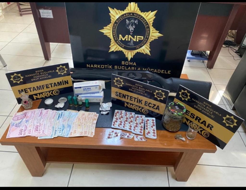 Manisa İl Emniyet Müdürlüğü Narkotik Suçlarla Mücadele Şube Müdürlüğü Soma Büro Amirliği görevlilerince uyuşturucu veya uyarıcı madde ticareti yapan, nakleden ve kullanan şahıslara yönelik yapılan çalışmalar kapsamında Soma ilçesinde bir ikamette yapılan aramada;▪12 gram Metamfetamin maddesi,▪12 gram Esrar maddesi,▪65 adet Sentetik Ecza,▪7115 TL uyuşturucu madde ticaretinden elde edildiği değerlendirilen para ele geçirilmiştir.Konuyla ilgili Ö. Ö. (27) isimli şahıs uyuşturucu veya uyarıcı madde imal ve ticareti yapmak suçundan gözaltına alınmış, sevk edildikleri adli makamlarca tutuklanmıştır.