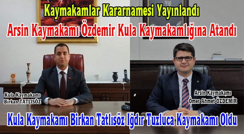 Kararmame ile Kula Kaymakamı Birkan Tatlısöz Iğdır Tuzluca Kaymakamlığına atanırken Kula Kaymakamlığına Trabzon Arsin kaymakamı Ömer Ahmet Özdemir atandı.