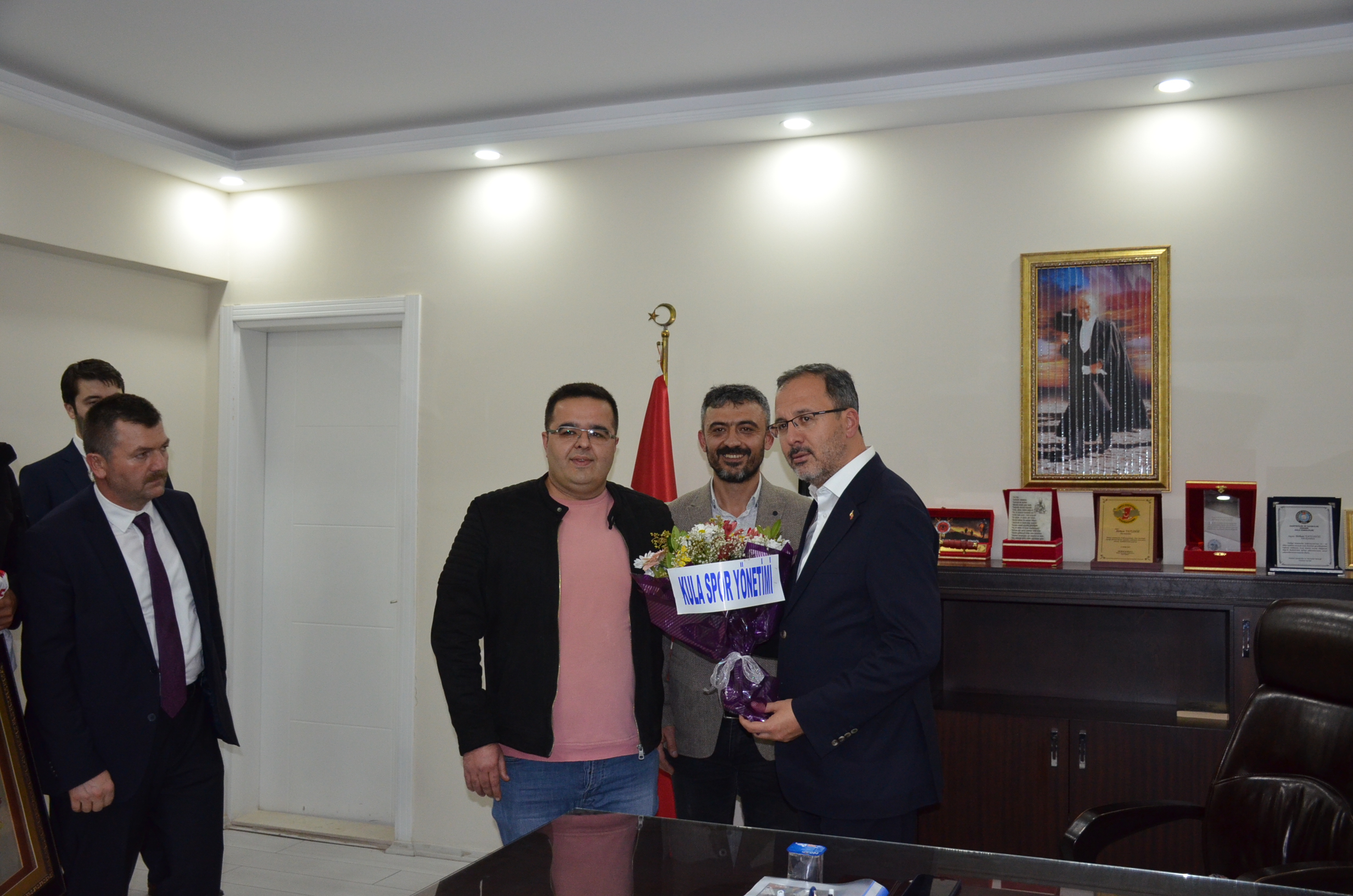 Gençlik ve Spor Bakanı Dr. Mehmet Muharrem Kasapoğlu’nun Kula ziyaretine Kula Kaymakamı Birkan Tatlısöz, Kula Belediye Başkanı Hüseyin Tosun, Manisa İl Spor ve Gençlik Müdürü Yunus Öztürk, Ak Parti ve MHP Kula İlçe Başkanları ve Bakanlık temsilcileri katıldı.