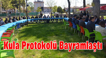 Kula Protokolü Bayramlaştı Ramazan bayramı münasebetiyle Kula Kaymakamlığının düzenlediği bayramlaşma programı bugün yapıldı. Kula Kent Meydanında bulunan 100. Yıl aile çay bahçesinde düzenlenen bayra...