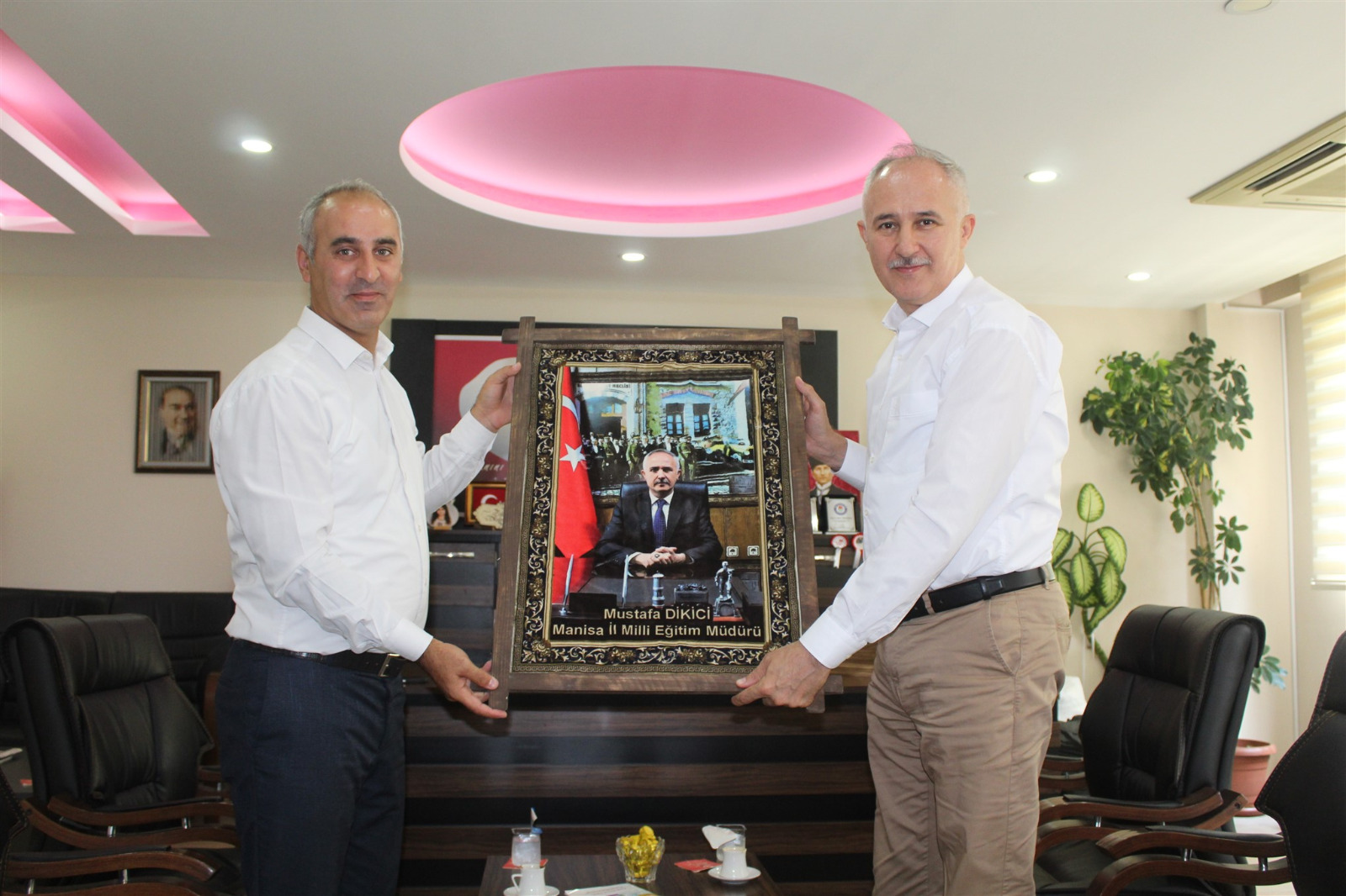 Toplantının ardından Kula’da inşaatı devam eden okulları gezen İl Milli Eğitim Müdürü Mustafa Dikici inşaatlar hakkında bilgiler alarak incelemelerde bulundu. Kula İlçe Milli Eğitim Müdürü Zakir Okulmuş İl Milli Eğitim Müdürü Mustafa Dikici’ye hatıra olarak resimli çerçeve hediye etti.