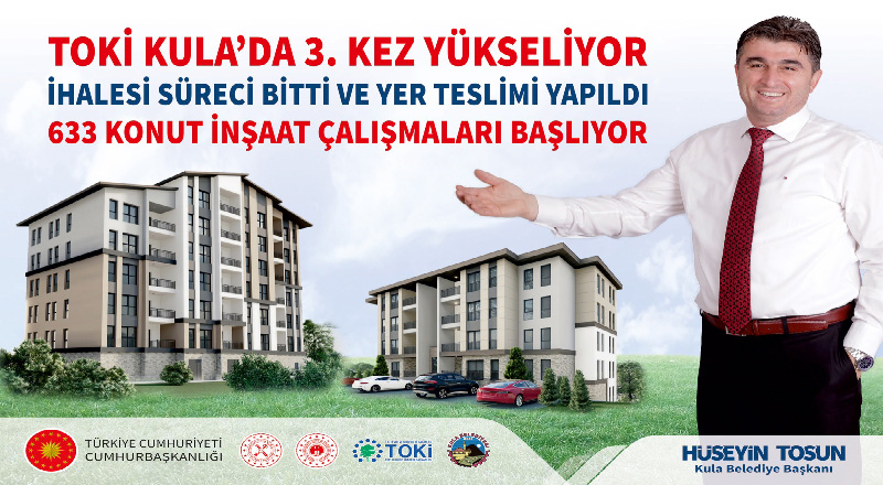 Çevre, Şehircilik ve İklim Değişikliği Bakanlığı ve Toplu Konut İdaresi Başkanlığı tarafından Kula ilçesinde planlanan 3. etap TOKİ projesinin yer tesliminin yüklenici firmaya yapıldığı müjdesini veren Kula Belediye Başkanı Hüseyin Tosun yaptığı açıklamada; “Çevre, Şehircilik ve İklim Değişikliği Bakanlığı ve Toplu Konut İdaresi Başkanlığı (TOKİ) tarafından “İlk Evim” projesi kapsamında Kula’mıza yapılması planlanan 633 sosyal konutun ihale süreci tamamlanmış, yüklenici firmaya yer teslimi de yapılmıştır. 6 Şubat’ta yaşadığımız Kahramanmaraş merkezli deprem felaketi gereği devletimizin tüm kurumlarında olduğu gibi TOKİ ‘nin de depremden etkilenen illerimizin yeniden imarı ve ihyası için tüm imkan ve yatırımlarını deprem bölgesine öncelik verdiği bu zor süreçte bile önceden planlanan 3. etap Kula TOKİ projesi gibi kamu yatırımlarında herhangi bir aksaklık ve gecikme yaşanmadan tüm hızıyla devam etmesi devletimizin büyüklüğünü ve gücünü en net şekliyle gösteren önemli bir ölçüdür.