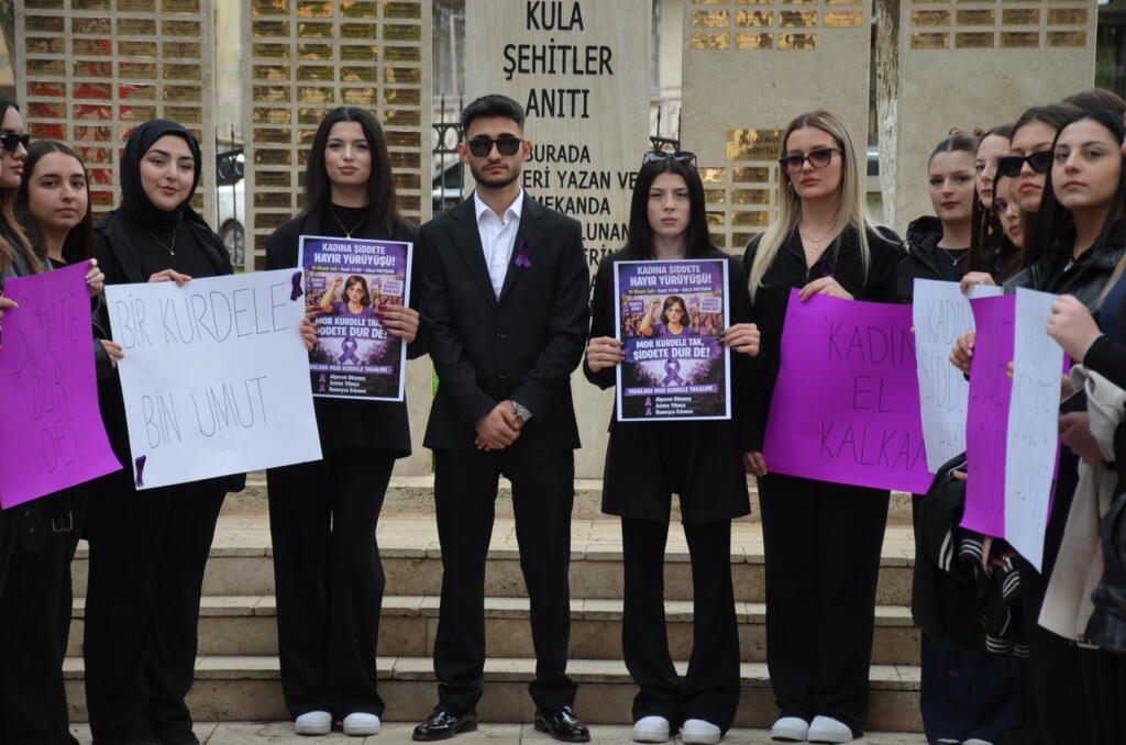 Kula Meslek Yüksekokulu öğrencileri, danışmanları ve müdürleri Doç. Dr. Ahmet Yavuz Çamlı’nın yönlendirmesiyle sosyal sorumluluk projelerini gerçekleştirmeye devam ediyorlar. Kula’da bir ilki gerçekleştiren üniversiteli öğrenciler kadına şiddete hayır yürüyüşü gerçekleştirdi. Yaklaşık 60 öğrencinin katıldığı yürüyüşte siyah giyim ve mor kurdele takılıp mesaj içeren pankartlar taşındı ve yürüyüş sonunda proje yürütücüleri tarafından basın açıklaması yapıldı: