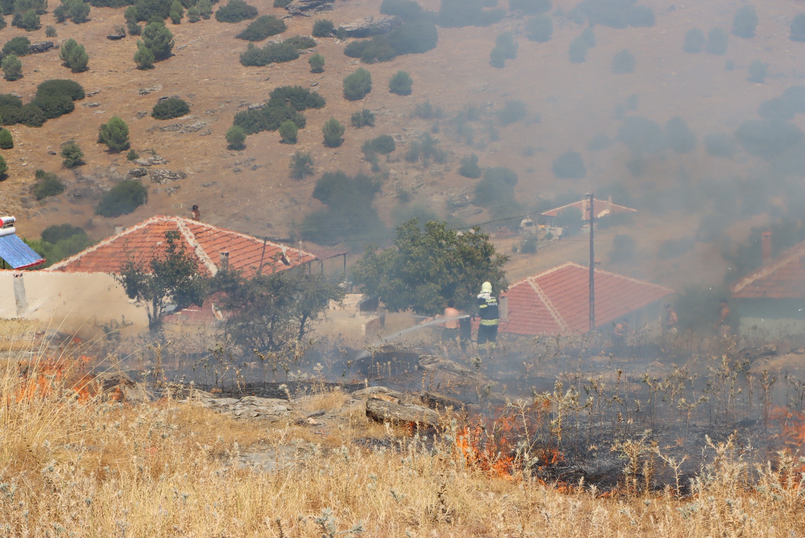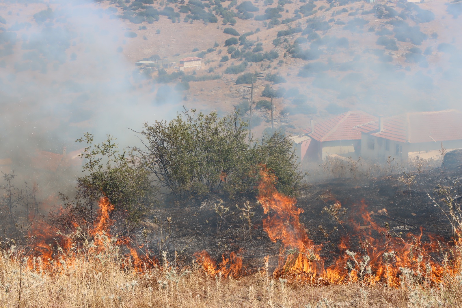Yerleşim yerlerine yakın mevkide çıkan yangına 3 itfaiye aracı, 1 tanker, 1 arazöz 2 pikap ve 18 personelle müdahale edilerek kontrol altına alındı.