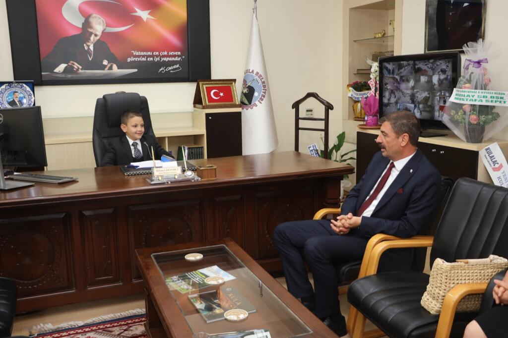 Türkiye Cumhuriyeti’nin kurucusu Gazi Mustafa Kemal Atatürk tarafından dünya üzerinde çocuklara armağan edilen tek bayram olan 23 Nisan Ulusal Egemenlik ve Çocuk Bayramı dolayısıyla Kula ilçesinde Tabduk Emre İlkokulu 4. sınıf öğrencisi Ege Kaan Erkaya, Kula Belediye Başkanlığı koltuğuna oturdu.