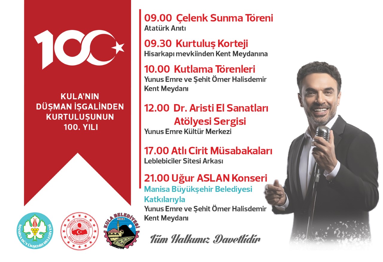 4 Eylül Kula İlçesi’nin düşman işgalinden kurtuluşunun 100. yıl dönümü coşku dolu bir programla kutlanacak. 4 Eylül Pazar günü, gün boyunca sürecek 100. yıl etkinliklerinde sanatçı Uğur Aslan sahne alacak.
