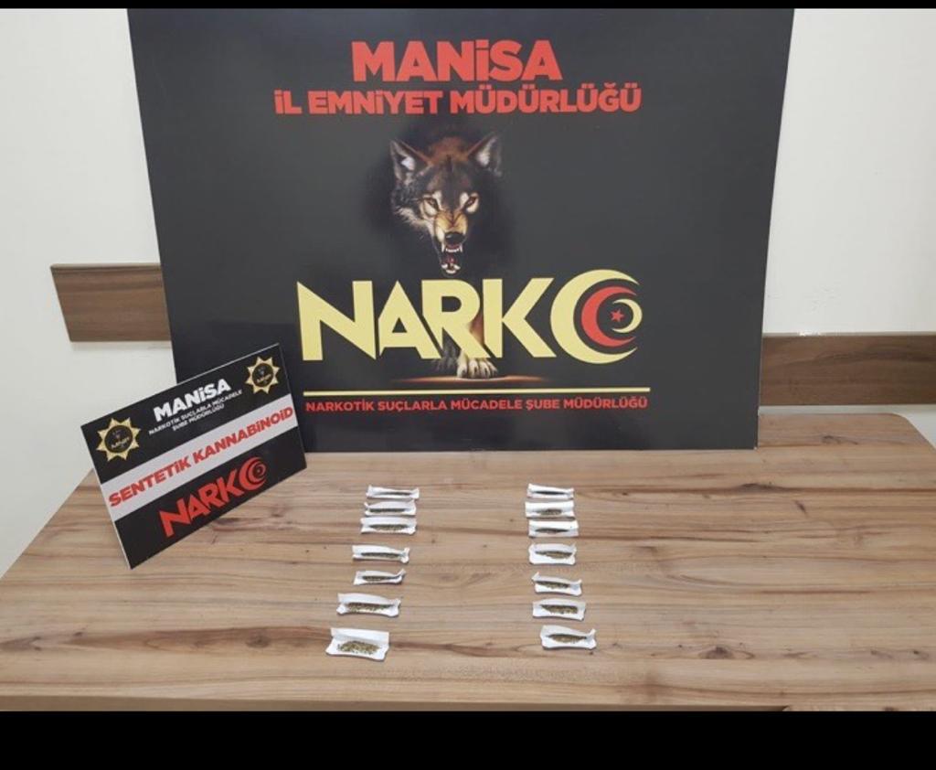Manisa Narkotik Suçlarla Mücadele Şube Müdürlüğü ve Asayiş Şube Müdürlüğü görevlilerince uyuşturucu veya uyarıcı madde ticareti yapan, nakleden ve kullanan şahıslara yönelik yapılan çalışmalar kapsamında bir şahsın üzerinde yapılan aramada;