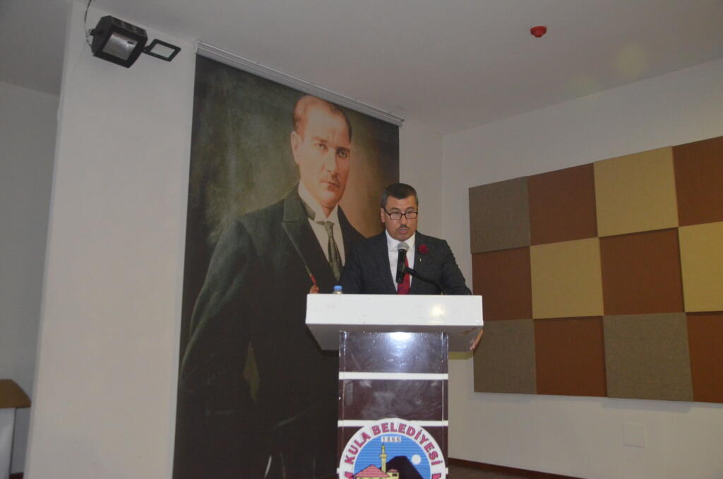 Kula Kent Meydanında bulunan Atatürk anıtı önünde düzenlenen çelen programı ile başlayan kutlama programında Atatürk anıtına Kula İlçe Milli Eğitim Müdürlüğü çelengi sunuldu. Saygı duruşu ve İstiklal Marşının okunmasıyla devam eden program Atatürk anıtı önünde son buldu. Kutlama Programı Kültür Merkezinde devam etti.