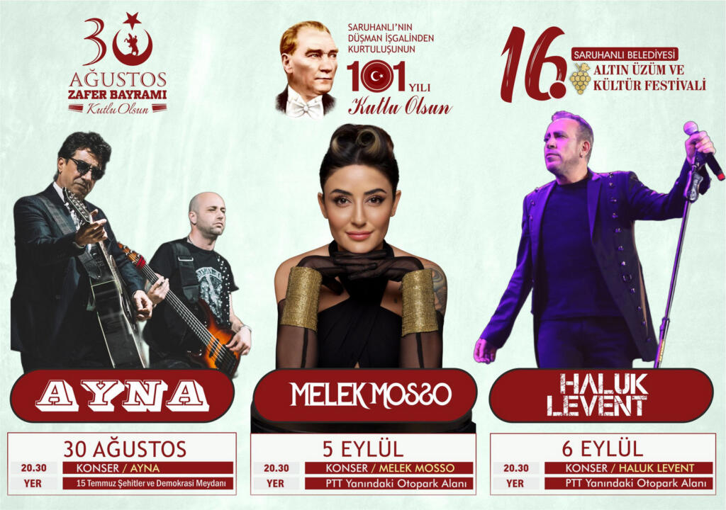 Saruhanlı Belediyesi tarafından bu yıl 30 Ağustos ile 10 Eylül tarihleri arasında gerçekleştirilecek olan etkinliklerin hazırlıkları devam ediyor. Festivalde müzik dünyasının ünlü isimlerinden Ayna, Melek Mosso, Haluk Levent ve Rumeli Ayhan sahne alacak.