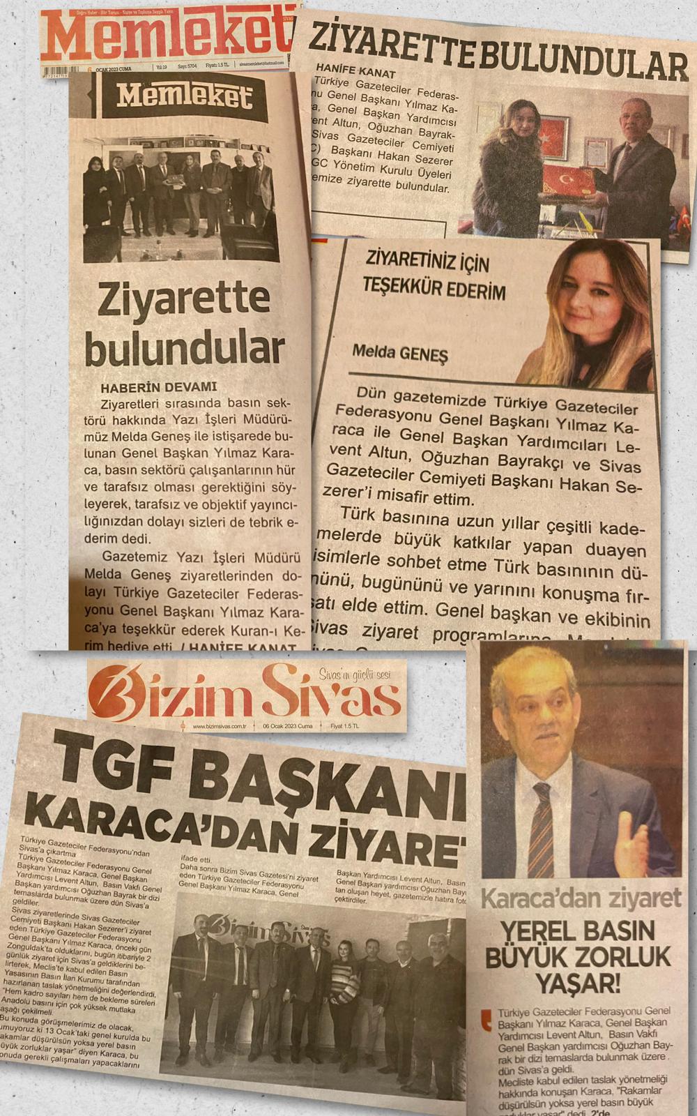 Türkiye Gazeteciler Federasyonu (TGF) Genel Başkanı Yılmaz Karaca, Genel Başkan Yardımcısı Levent Altun ve Basın Vakfı Genel Başkan Yardımcısı Oğuzhan Bayrak, Sivas programını çeşitli ziyaretlerle tamamladı.