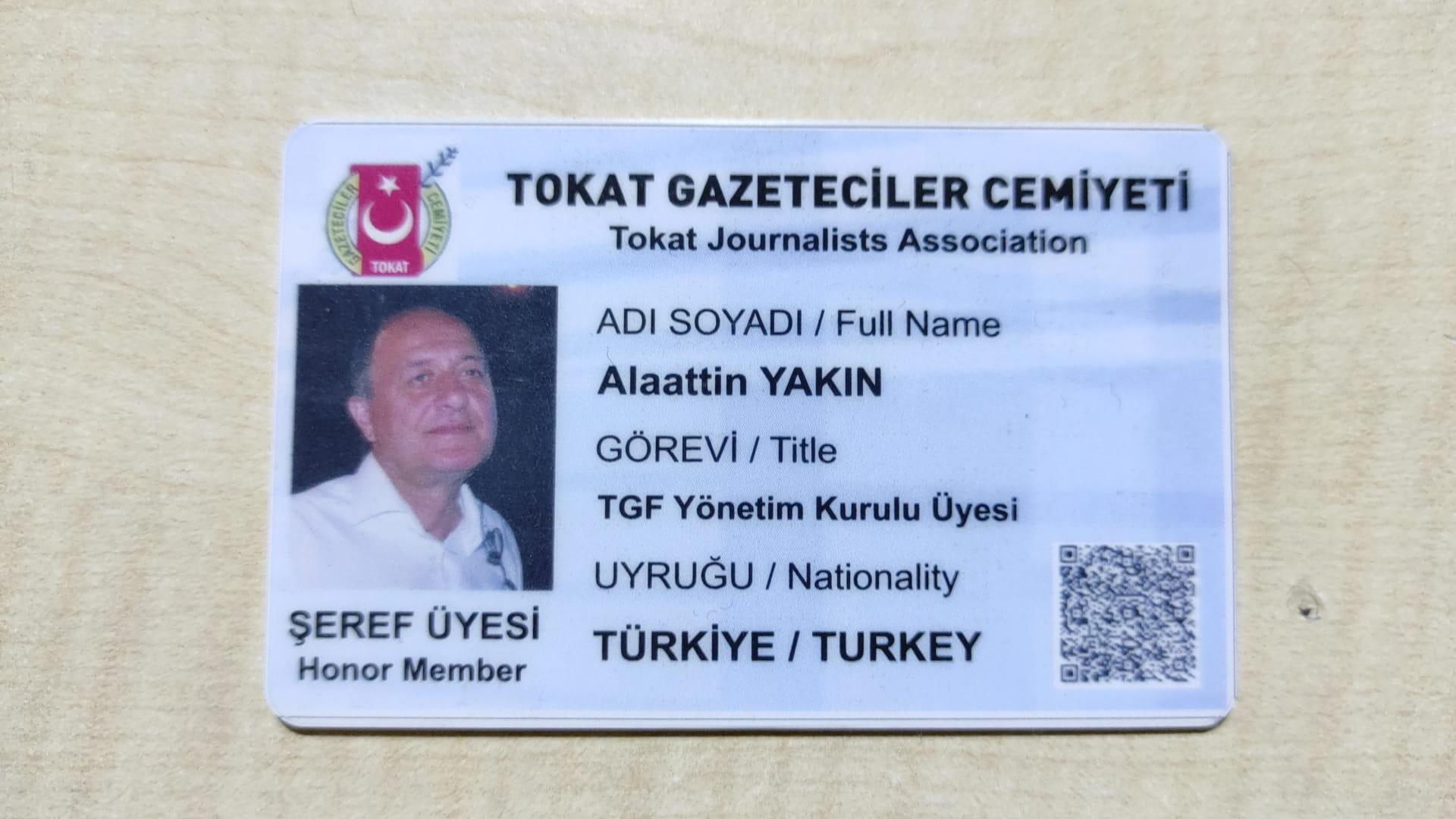 Tokat Gazeteciler Cemiyet başkanı Cemal İncesoyluer “Yönetim kurulu kararıyla basına vermiş olduğu desteklerden dolayı, Türkiye Gazeteciler Federasyonu Yönetim Kurulu Üyesi, Manisa Gazeteciler ve Yayıncılar Derneği Başkan Vekili ve Kula Denge Gazetesi İmtiyaz Sahibi Alalettin Yakın’a cemiyetimizin Şeref Kartının Verilmesi uygun görülmüştür.